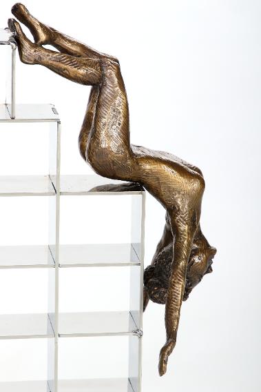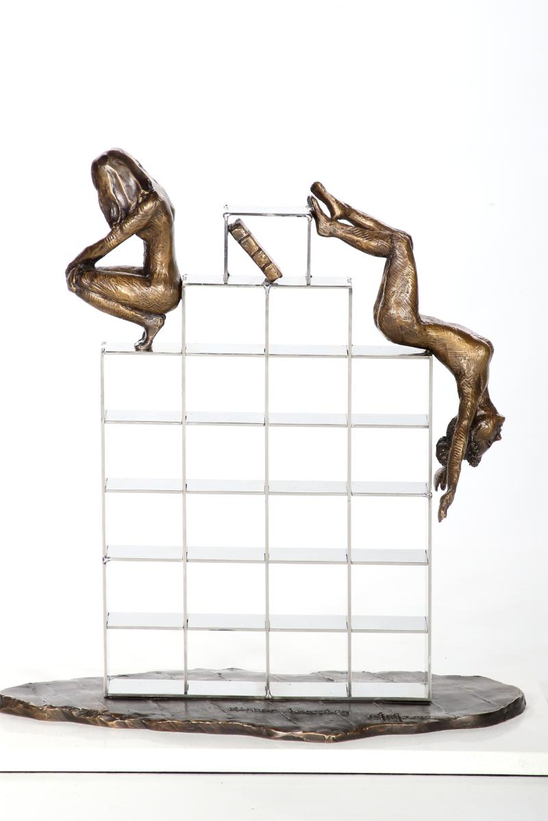 Between them, the pyramid of empty shelves becomes a metaphor for the scaffolding of human growth: the things we learn, unlearn, carry, discard, question, and rebuild.