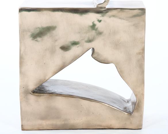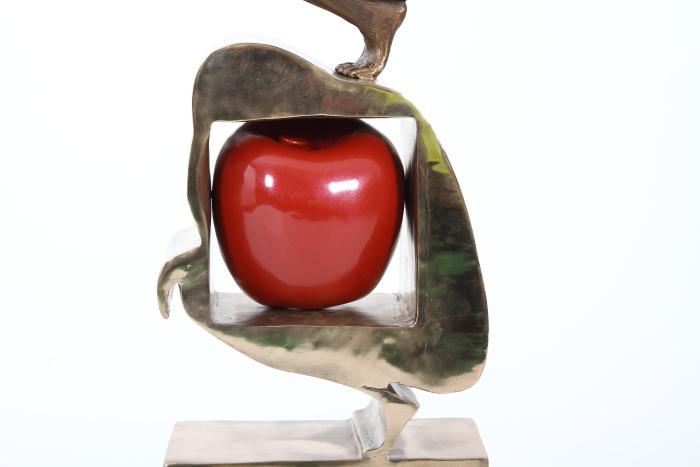 “This piece plays with 2D and 3D spacial dimensions: reality and the essentials. Eve’s Heart turns out to be an apple after all. The base is the enlargement of the missing square that allows us to see beneath the surface” MM